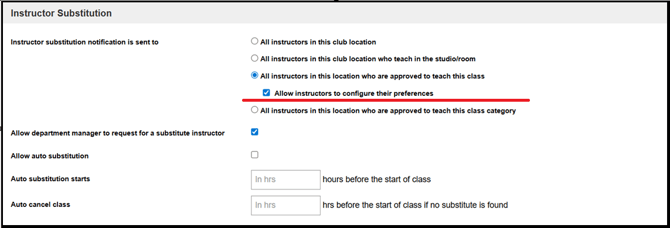 All instructors in the club location who teach in the Room/Studio - This option will send the substitution request to instructors who teach at the same Room/Studio where the substitute was requested.