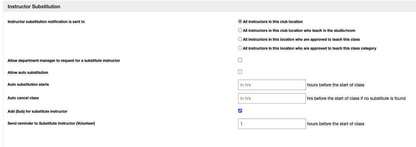 - Send reminder to Substitute Instructor (Volunteer) - If enabled, an email and a push notification reminder is sent to the instructor to remind them that in 'x' hours, you have an upcoming class which you've volunteered to teach.